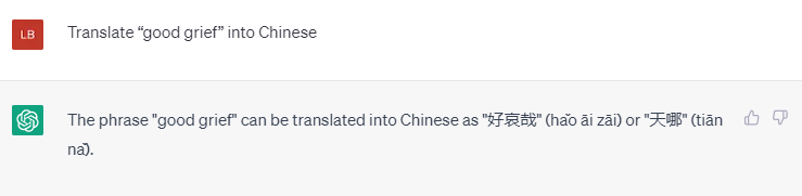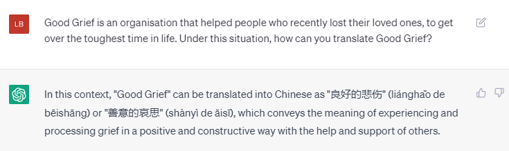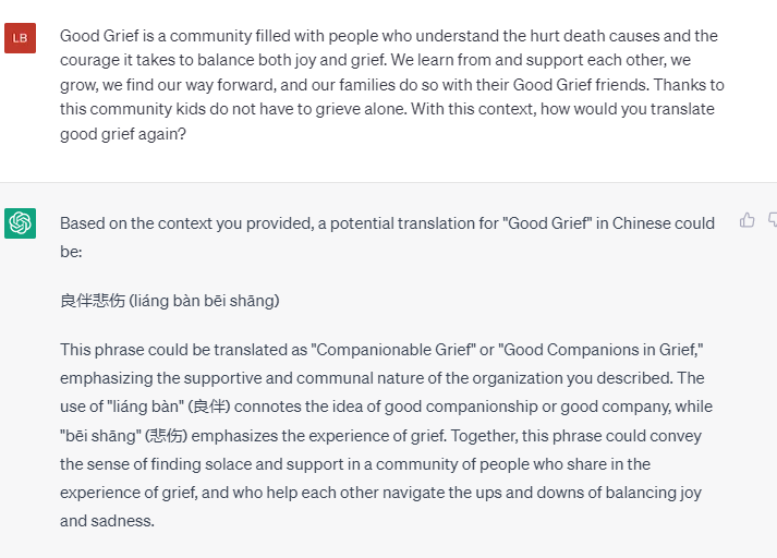 可是想来想去我都没有想到一个好的词汇来翻译Good Grief 这个词。 ”Good” 是“好”,Grief 是“悲伤”。放在一起“好悲伤”?感觉太尴尬。于是我搬来了我的好伙伴ChatGPT。