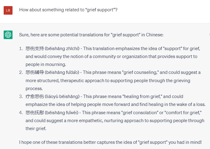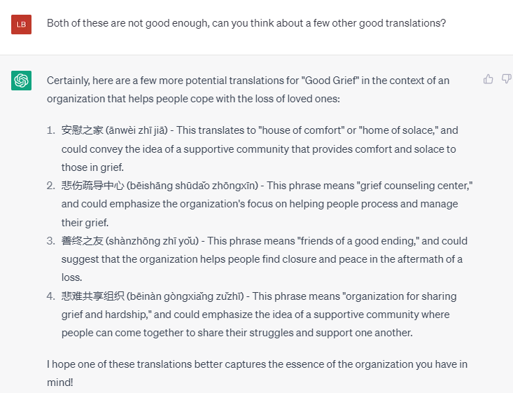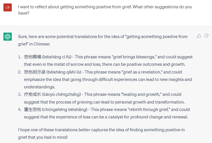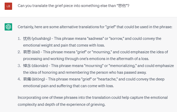 这次ChatGPT给了一个非常不合情的词,“美好丧亲之痛”?我只能告诉它这个翻译太诡异了。再来点其他的选择。