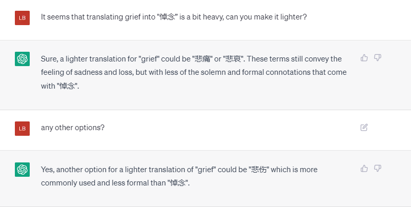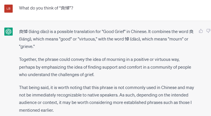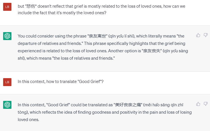 的确“哀”和“悼”这两个词都有Grief 的意思,而“悼”更能体现主旨。我突然想到可以直接翻译成“良悼”这个词。我想继续听听ChatGPT 的意见。