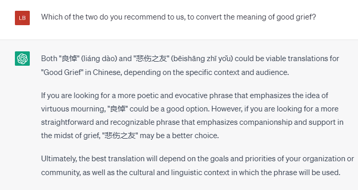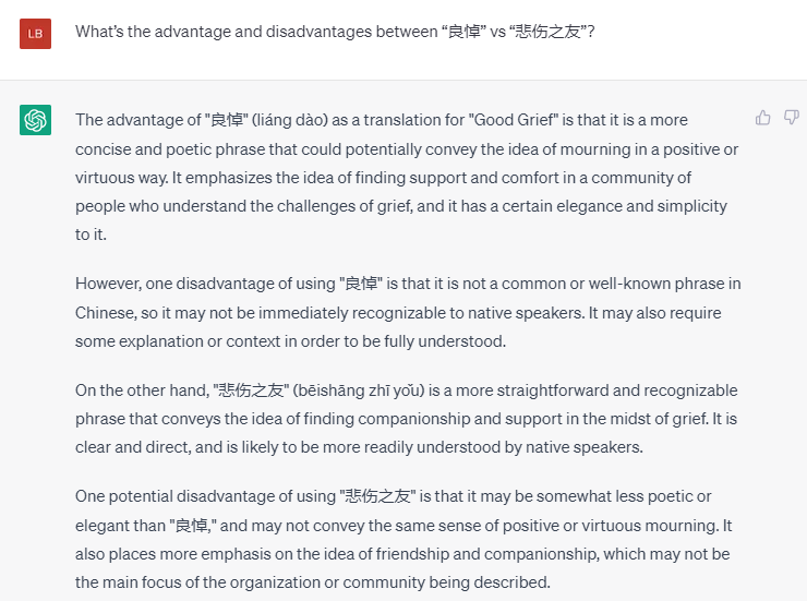它同样“良悼”可以表示出Good Grief 的意思,但也有一个缺点,就是这个词不一定立马能让人知道是什么意思,它建议也许可以用一个更容易听出意思的词。说得还是非常有道理。同时我也在考虑它之前提过的“悲伤之友”。我有一点点纠结,那再问问ChatGPT 这两个词的优越点吧。