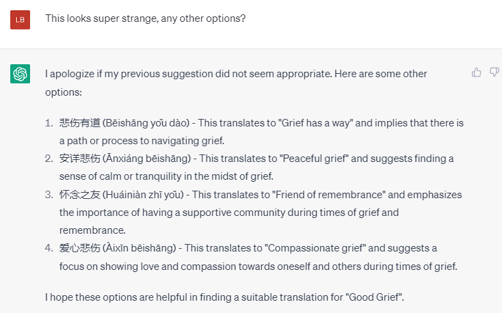 后记,在和朋友讨论这个Good Grief 的翻译的时候,朋友觉得悼念这个词,显得非常沉重。我想把这个反馈问问ChatGPT 有没有其他更合适的方式。