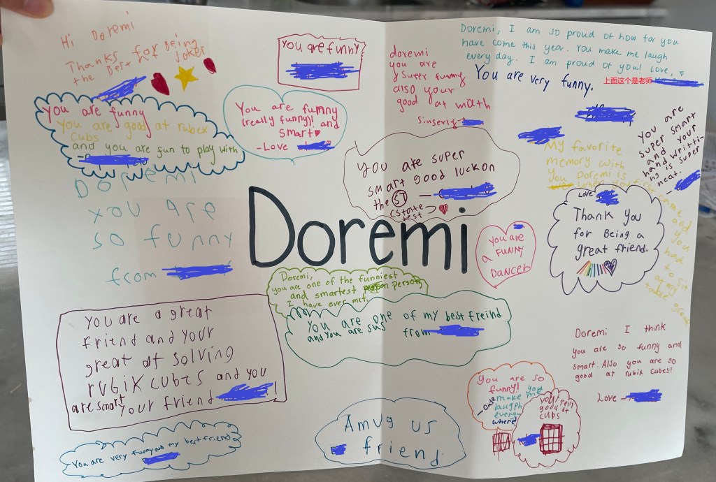 为保护孩子和老师隐私,图中孩子同学和老师的名字都隐去了