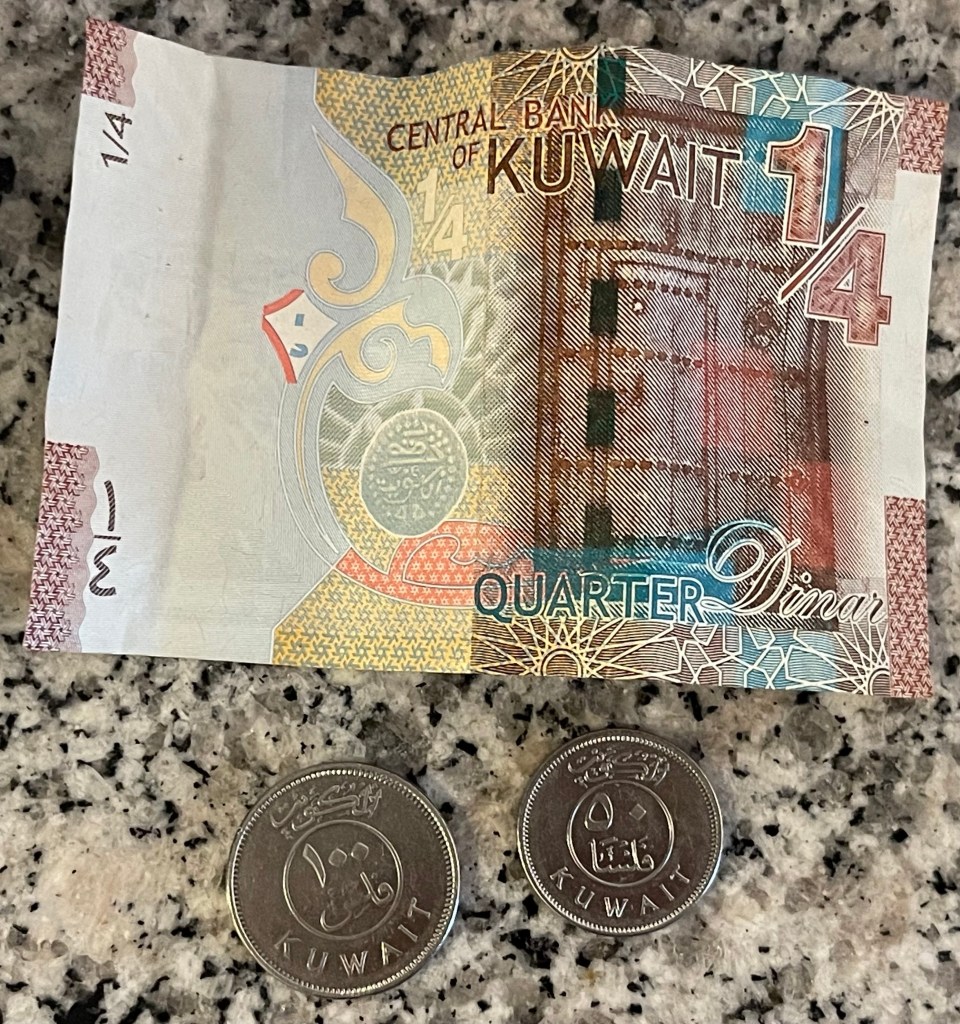 我们赶紧回机场候机楼等车,好在谷歌地图估算的车时间非常准。我们提前一分钟出候机楼,13路就到了。之前先生查到科威特的巴士一块钱能坐一整天,于是给司机递过去3块钱。结果那哥们告诉我们只要300舍费尔一个人(1科威特币等于1000舍费尔),小孩不要钱。于是我们给了他一块科威特币之后,他找了我们一张纸币和2个硬币。看到那张纸币我要笑死了,头一次看到有用分数表示的纸币,1/4块钱。 另两个硬币,上面的数值,我也完全看不懂到底是多少钱。😂