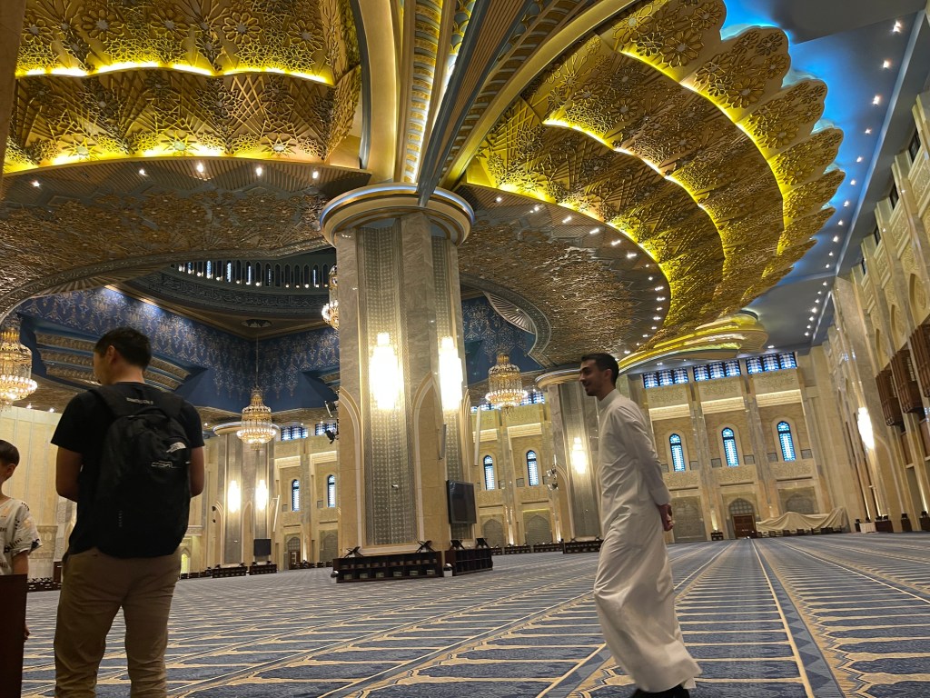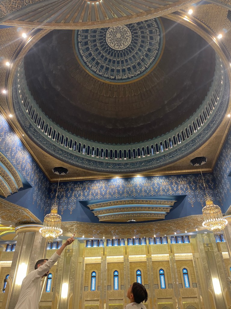 寺庙里铺满了阿拉伯特色的蓝白花纹地毯,墙面也都是阿拉伯特色的花纹瓷砖,还是从全国各地进口的。正中间顶上有一个巨大的Dome,在里面说话,回声能从四面八方传来。