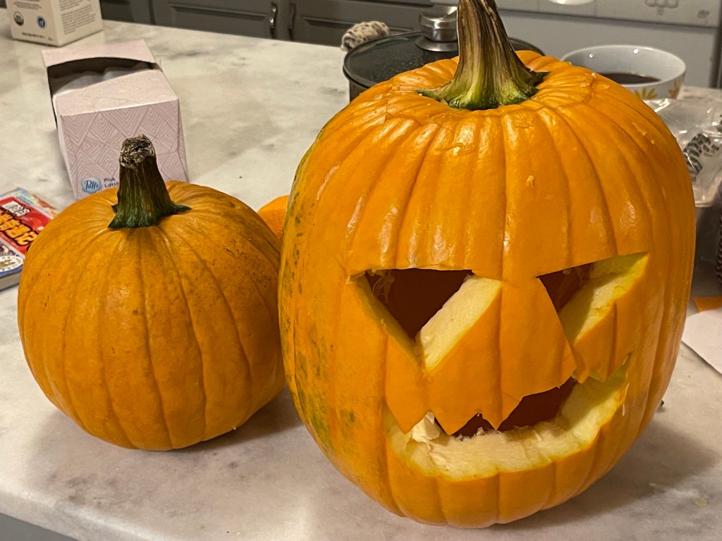 老大一回家,就迫不及待地刻了个万圣节的南瓜。老二学校马上要过南瓜日了,赢来的小南瓜也马上有用武之处了。