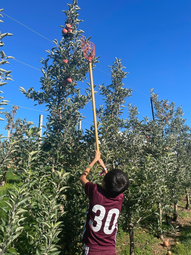 非常熟的苹果树已经不多,小朋友找找还是有。很多熟的苹果都在高处,哆来咪和咪来哆两个在入口租了一个长铁网架,举着架子在苹果下面一顶,苹果就下来了。小朋友们非常开心,到处找苹果来摘。