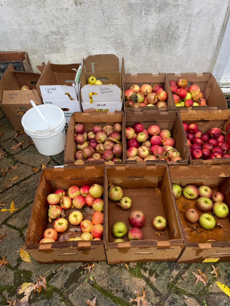 Theresa开始给我们解释Apple Cider 苹果酒的制作过程。他们提前买了八九种苹果回来,每一个品种都买了一筐。