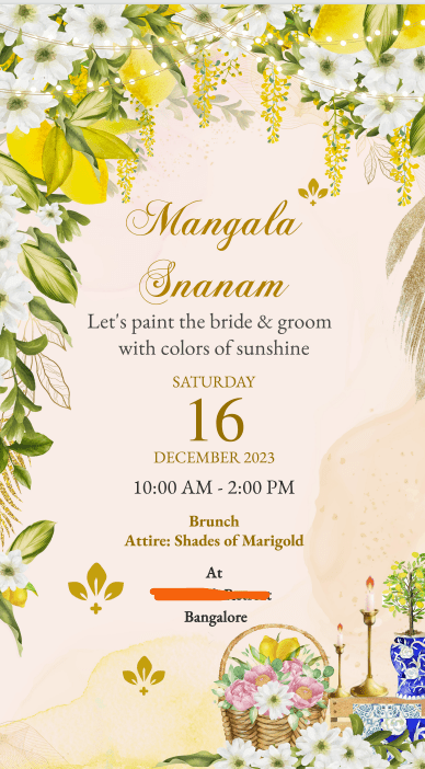 周六上午10-2点: 给新人一点阳光和色彩? 这是什么? 我赶紧查了一下,Mangala Snanam代表圣浴,是一种宗教仪式。还发现给新娘的手和脚彩绘,也是一个传统的印度婚礼仪式。