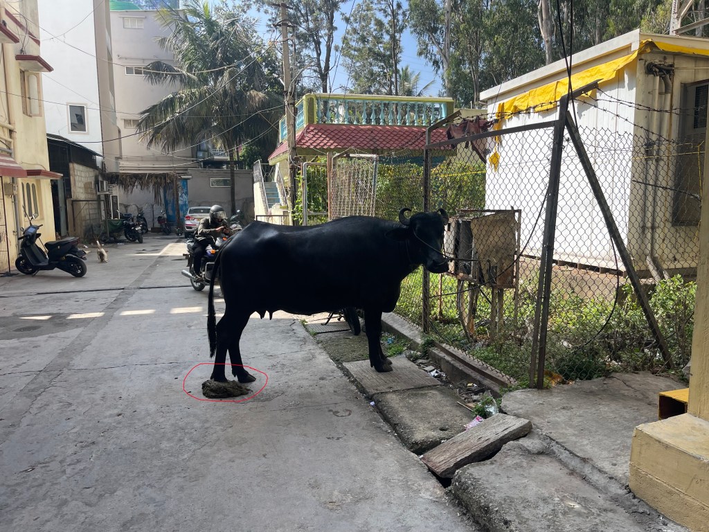 第二天出门,看到了一头牛,悠闲地在酒店门口干“大“事。
