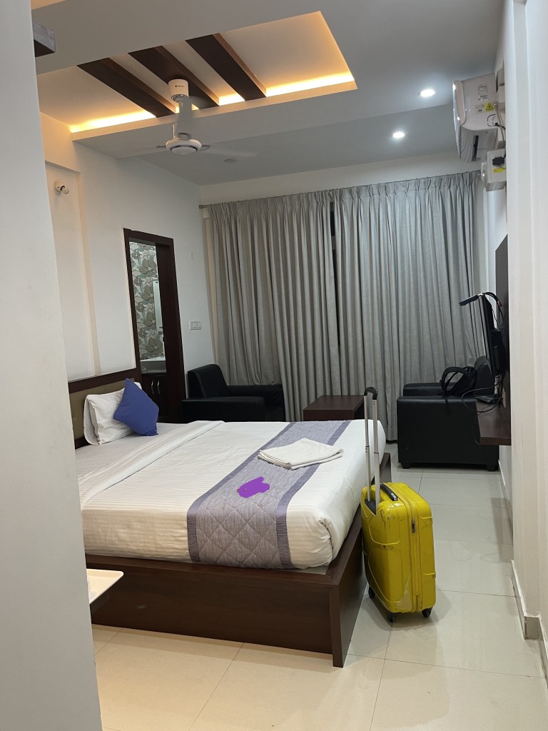 一路上找了两三家看起来更加正规的旅馆,都客满了。最后找到一家叫Sri Hari Presenta 的酒店,前台看起来比同街的小旅馆都高大上很多,比我之前住的机场三星级酒店Gateway Inn也要高大上很多。我甚至有点不相信它只是三星级,它不仅有位,还只要1500卢比一天,我开心地入住了。