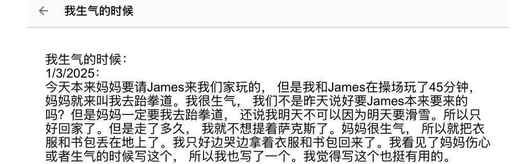 天哪,他居然用起了我最常用的情绪管理法,把情绪写下来。还跟我说,“妈妈,我觉得写完,我自己感觉好多了。”