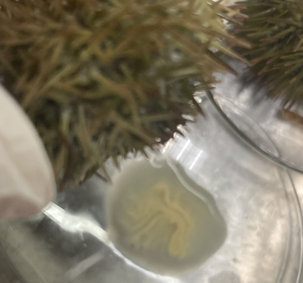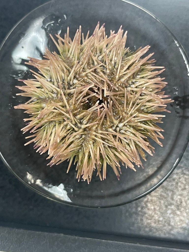 我们的实验对象是几只活的海胆,有公有母。中间圆圆的孔是海胆的嘴巴,底下是海胆的屁股。为了促进它排卵/排精,我们需要从嘴的周围注射2.5ml 左右的氯化钾(KCl)溶液,氯化钾能刺激性腺壁收缩,从而促进排卵/排精。